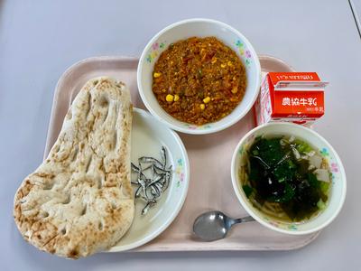 今日の給食は、ナン、牛乳、ドライカレー、ミックススープです。ナンは小麦がよくとれる北インドの食べ物です。南の方は米がとれるので米のカレーになります。