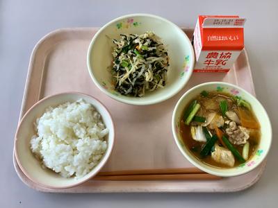 今日の給食は、ごはん、牛乳、豆腐のチゲ風、切り干し大根の磯香和えです。切り干し大根は、カルシウムやビタミン、マグネシウムなどが豊富で、実は大根よりも栄養価が高いのです!