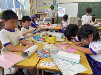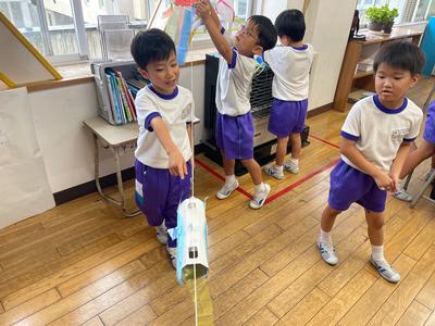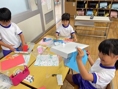 1年生が図工で『スルスル ゴー』を制作していました。ひもにフックをかけてすべりおりる『何か』をつくります。クラゲや気球、飛行機など、アイディアあふれる2時間でした。