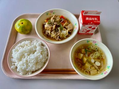今日の給食は、ごはん、牛乳、豚肉と野菜のみそ炒め、とうふのすまし汁、みかんです。今日はみかんを楽しみに登校した子もいましたよ。