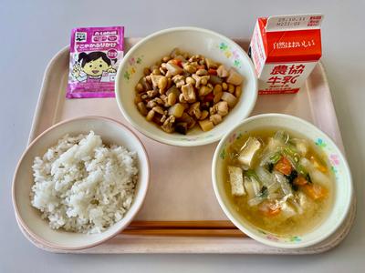 今日の給食は、ごはん、牛乳、五目煮豆、小松菜の味噌汁、ふりかけの『アイアン献立』です。五目煮豆の野菜やこんにゃくは、すべて大豆と同じ大きさにカットされています。調理員さんの職人技です。