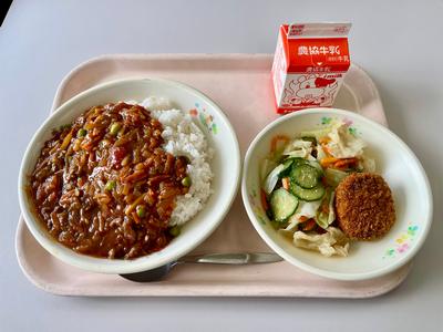 今日の給食は、ハヤシライス、牛乳、緑しきぶきゅうりのサラダ、吉川なすフライの『地場産プラスワンふるさと献立』です。吉川なすフライは食べ応え十分の逸品でした!