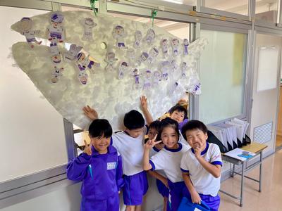 1年生の教室に『くじらぐも』が泳いでいました。『くじらぐも』には、1年生みんなが乗っていましたよ。