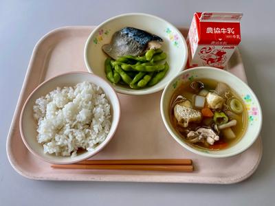 今日の給食は、ごはん、牛乳、芋煮汁、さばの塩焼き、えだまめの『省塩献立』です。芋煮汁には、たくさんの里いもが入っていました。