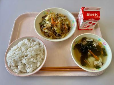 今日の給食は、ごはん、牛乳、チャプチェ、じゃがいもとわかめの中華スープです。家でチャプチェをつくると、どうしても春雨が『もっさり』してしまうのですが、給食の春雨は『つるん!』としています。
