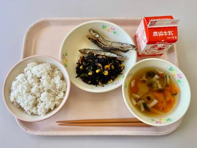 今日の給食は、ごはん、牛乳、シシャモのから揚げ、ひじきの五色煮、秋のすまし汁の『歯ッピー献立』です。すまし汁には、大きなさつまいもやキノコ、ニンジンがたっぷり入っていて、彩も鮮やかでした。