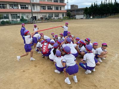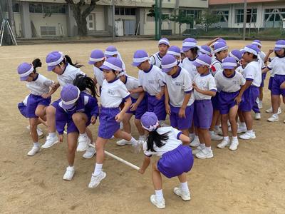 3,4年生が『台風の目』を練習していました。前回は赤組が圧勝だったとのこと。今日は『足抜き』の練習を重ねた白組が圧勝しました。