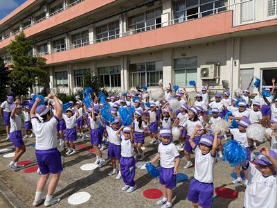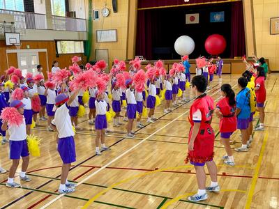 応援練習も体育館と東出入口ピロティに分かれて行われました。今日から小道具や衣装が登場しました。