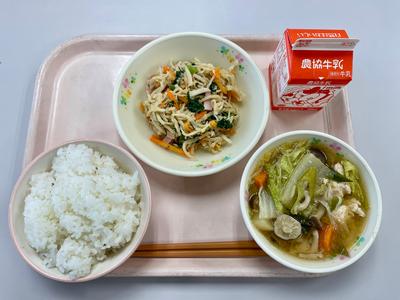 今日の給食は、ごはん、牛乳、鶏味噌なべ、切り干し大根のごまサラダの『歯ッピー献立』です。いつもは350mg前後のカルシウムが、今日は458mgも含まれています。