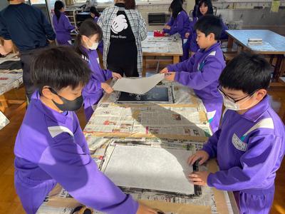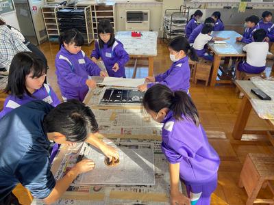 先週欠席が多かった3年生も、遅れを取り戻そうと、みんなで協力して版画の仕上げです!「ずっと手伝ってて、背中が痛いです!」ありがとう。その頑張りのおかげで、何とか間に合いましたよ。