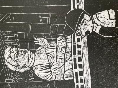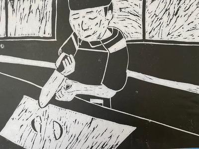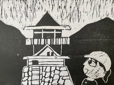高学年の廊下に、版画の作品が掲示されています。『校内版画展』のようです。いくつか作品を紹介します。
