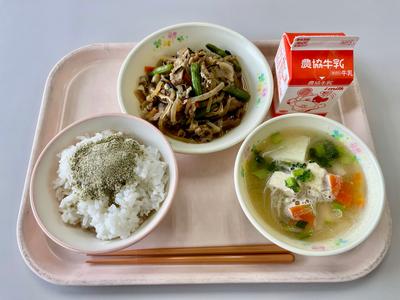 今日の給食は、ごはん、牛乳、豚肉とひじきの炒め煮、豆腐の味噌汁、手づくりふりかけです。手づくりふりかけのおかげで、今日の給食のカルシウム量はとても多いです。