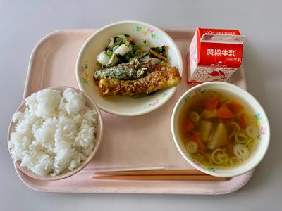 今日の給食は、ごはん、牛乳、ちくわの二色揚げ、お和え、ぼっかけ汁の『ふるさと献立』です。甘めのごまみそで野菜を和えた『お和え』、大好きです。