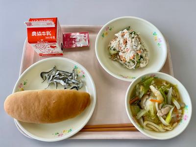 今日の給食は、減量パン、牛乳、かやくうどん、ペアジャム、切り干し大根とツナのサラダ、にぼしです。今日は早朝から校地、通学路の除雪でした。うどんが胃袋にしみわたりました。
