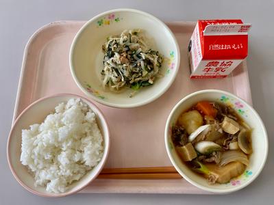 今日の給食は、ごはん、牛乳、すき焼き煮、切り干し大根の磯香和えです。『すき焼き煮』に入っている『凍り豆腐』は、『レジスタントタンパク質』が多く含まれる『スーパーフード』です!