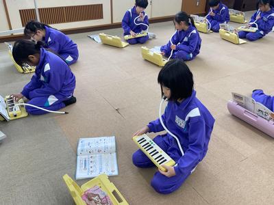 2年生が鍵盤ハーモニカの学習に取り組んでいました。3つの音を使って、自分だけの旋律をつくります。自分で練習したあとは、グループで発表していました。
