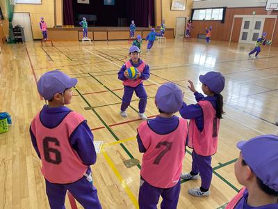 4年生の体育では『ポートボール』に取り組み始めました。『走りながらパスをする』『ドリブルをしながら走る』をみんなで確認していました。