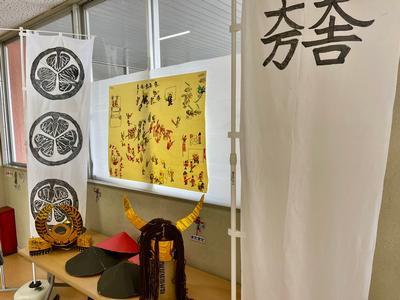 『百足』を制作した児童の作品を一堂に集め、校長室前で『個展』を開催しています。『年表シリーズ』『合戦シリーズ』『段ボール作品』があります。ご来校の際は、ぜひご覧ください。