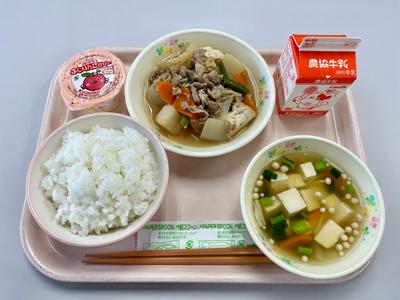 今日の給食は、ごはん、牛乳、豚肉とこんにゃくのみそ煮、とうふとえのきのすまし汁、リンゴゼリーです。今日はなかなか気温が上がりませんでした。みそ煮とすまし汁が体を温めてくれます。