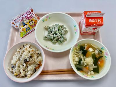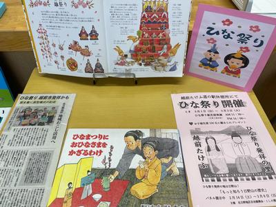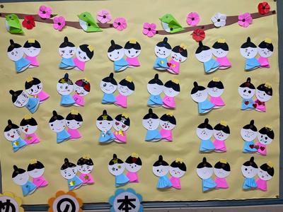 今日の給食は、五目寿司、牛乳、いんげんとツナのマヨネーズ和え、鶏肉のすまし汁、ひなあられの『ひなまつり献立』です。図書支援員さんが、図書室も『ひなまつり一色』にしてくださいました。『ひなまつり』で盛り上がる北日野地区です!