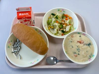 今日の給食は、コッペパン、牛乳、鶏肉とさつまいものクリーム煮、ビーンズサラダ、にぼしです。クリームから感じられるさつまいもの甘さが、何とも言えません。