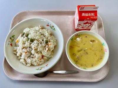 今日の給食は、チキンピラフ、牛乳、パンプキンポタージュです。今日は肌寒い1日でした。ポタージュの大きなカボチャが体を温めてくれました。