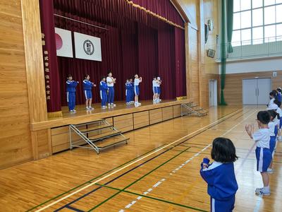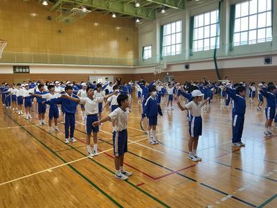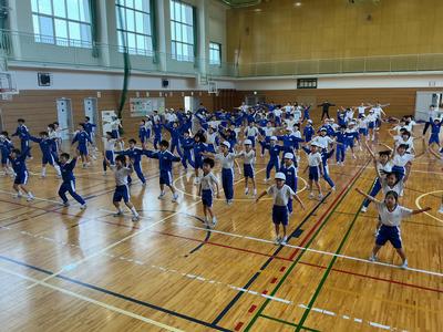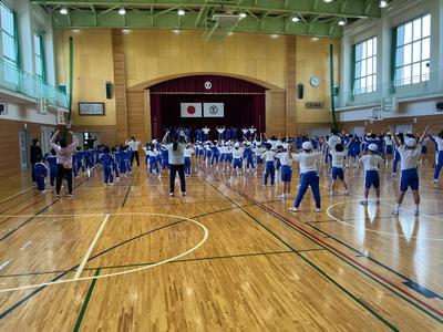 今日のパワフルタイム(大休み)は、体育館に全校児童が集まり、5月の体育大会の準備運動で行うラジオ体操を練習しました。体育委員のお手本を見ながら、大きな動きで準備運動を行なっていました。