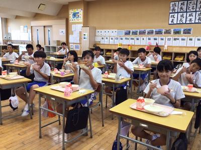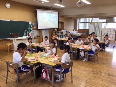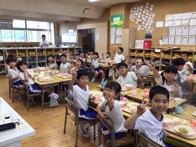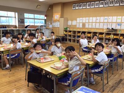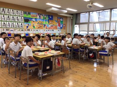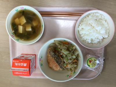 今日は、地場産食材を活用した副食やデザートを1品追加するという「地場産プラスワン給食」でした。これは、給食を通して福井の自然、歴史、文化、伝統行事、産業等を学んでいくことを目的とする市の取組です。第1回目のプラスワンは「ふくいサーモン」。福井県で養殖されたトラウトサーモン(ニジマス)のフライです。各教室でトラウトサーモンについての説明動画を見てから食べました。脂がのっていて、とてもおいしかったですね。