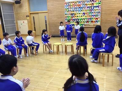 大休みに、レッツハッピータイムが行われました。今回は1年生がリード学年となり、ゲームの進行や説明を担当しました。初めてとは思えないほど分かりやすい説明で、活動はスムーズに進みました。上級生も声をかけ合いながら協力し、学年を越えた温かな交流の時間となりました。