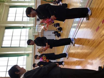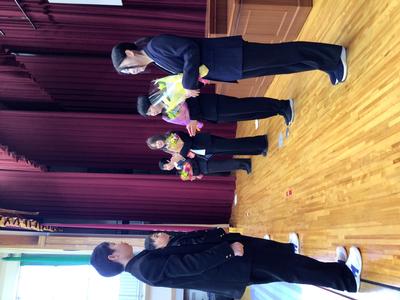 第3学期終業式、修了式が行われました。校長先生から各学年ごとに良さや成長をほめていただき、子どもたちはとても満足そうな様子でした。続いて、離任式が行われました。離任される先生方からメッセージをいただき、これまでのいろいろな思い出がよみがえりました。その後、代表児童から感謝の言葉と花束が贈られました。4人の先生方、本当にお世話になりありがとうございました。
