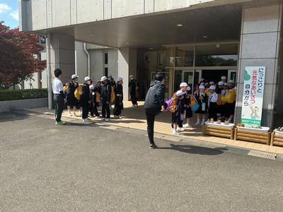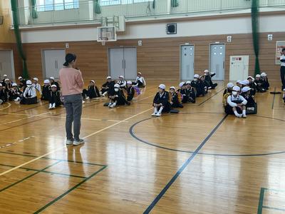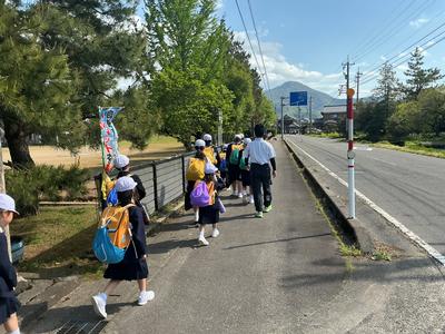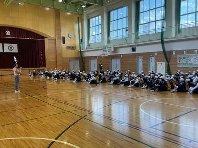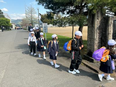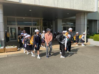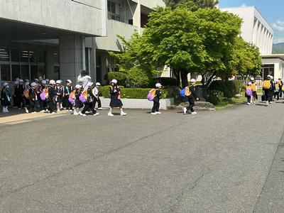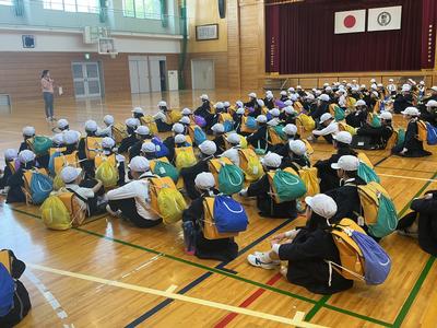 本日、集団下校訓練をしました。体育館に町内ごとに整列し、生徒指導担当の先生からお話を聞いた後、班長を先頭に1列になって下校しました。先生方も途中まで、一緒に歩き、下校の様子を観察しました。