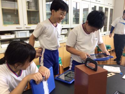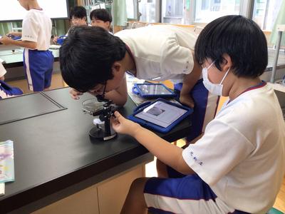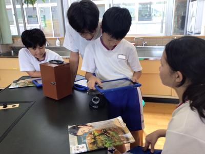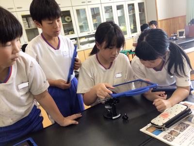 理科の「大地のつくり」の学習で、火山灰の観察を行いました。水で汚れをとった火山灰の中にどのような粒が見られるのかを顕微鏡で見て、iPadに記録しました。ガラスのような粒や赤や黄色の角ばった粒が見られ、感動している児童が多かったです。次回は地層のでき方の実験を行います。