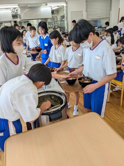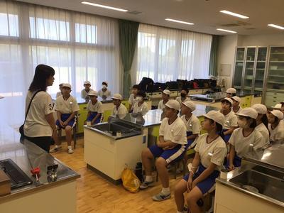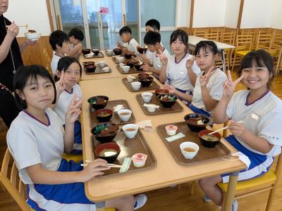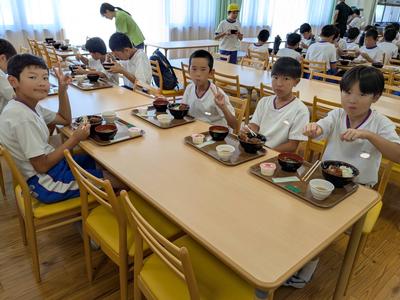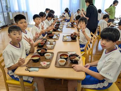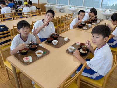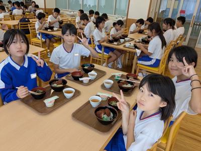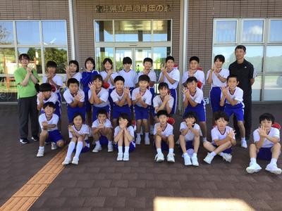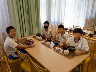 芦原青年の家に着きました。風が少し強いですが、爽やかな晴天のもと、まずは集合写真を撮りました。入所式を行った後、昼食を食べました。みんなの大好きなカツ丼でした。お腹もいっぱいになったところで、いよいよ午後の活動が始まります。