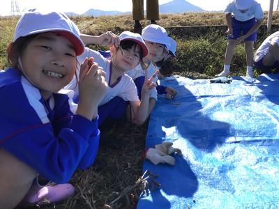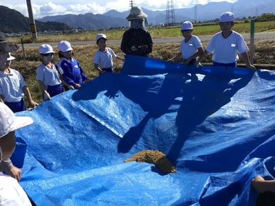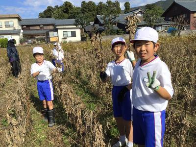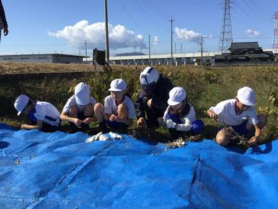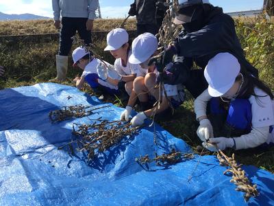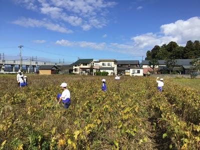 中新庄町にある「夢希農」さんの大豆畑に行き、大豆収穫体験をしました。子どもたちは、葉っぱが落ち、さやも茎も茶色く変化した大豆の様子にびっくりした様子でした。しっかり乾いた大豆は、枝ごと振るとカラカラと音がします。一つ一つさやから取り出すのもなかなか時間がかかり、手作業の大変さを感じていました。冬には、この大豆を使って味噌やきな粉、湯葉、打ち豆作りを体験する予定です。