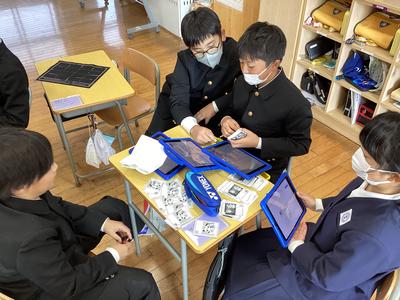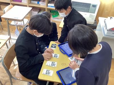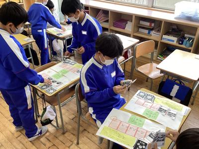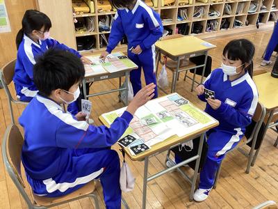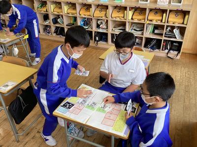 修学旅行や学習発表会でゆるキャラとして発信してきた北新庄地区の魅力を、今度はカード化して広めていこうと計画しています。その名もK(北新庄)Y(ゆるキャラ)B(バトル)。自分たちが作ったゆるキャラにちなんだ効果と特徴をみんなで考えています。みんなに楽しんでもらえるような、カードゲームにするために、休み時間もアイディアを出し合っています。完成するのをお楽しみに!