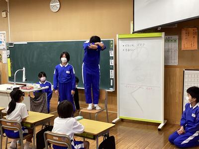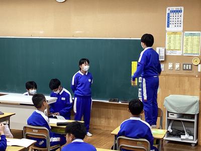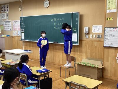今日は、6年生が、国語で勉強している狂言「柿山伏」の音読を、各学年の教室で披露しました。6年生は、カラスと鳶の場面を身ぶりや動きを交えながらテンポ良く読みました。言葉のすべてがわからなくても、声の調子や表情、動きから、内容がしっかり伝わり、低学年の子どもたちも思わず笑ってしまうほどでした。6年生の堂々とした発表に、大きな拍手が起こった素敵な時間となりました。
