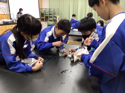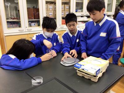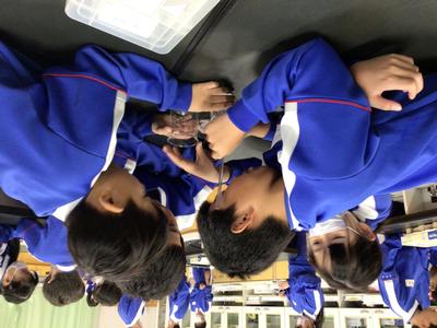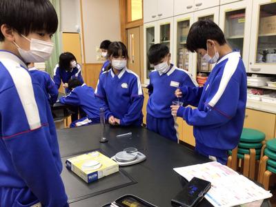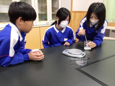理科「物のとけ方」で、食塩が水に溶ける量について学習しています。今日は、50mlの水に20gの食塩を溶かそうとしましたが、どうしても溶けません。それで、「水に溶ける食塩の量には限りがある。どうしたら溶かすことができるのか」について班で話し合いました。水の量を増やす方法と食塩水を温めるという方法が出ました。次の時間には、それぞれの班の方法で実験を進めていきます。