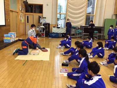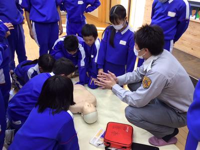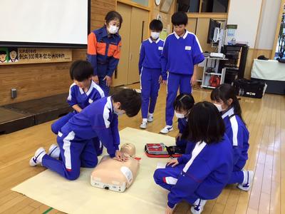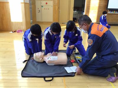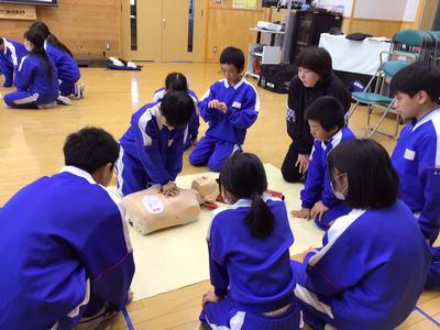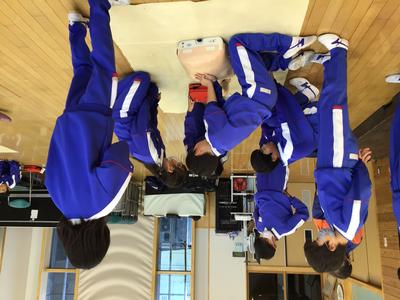 今日の5、6時間目に、南越消防組合の救命士の方と越前市消防団「式部さくら分団」の方から、胸骨圧迫やAEDの使用について詳しく教えていただきました。命を救わなければならないという緊張感の中、一生懸命に実習に取り組んでいました。いのちを救う知識・技術と、いのちを救う勇気の大切さを知ることができました。今後に生かしていきたいですね。