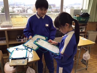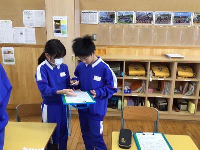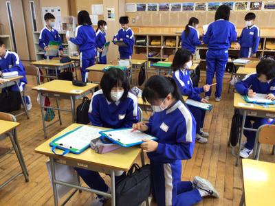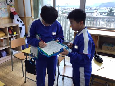 始業式の後の学活は、恒例の「冬休みビンゴ!」をしました。冬休みにしたことなどを友達にインタビューしてサインをもらいました。「今年もよろしくお願いします」と新年のあいさつをし、いろいろな友達に積極的に話しかけて楽しんでいました。