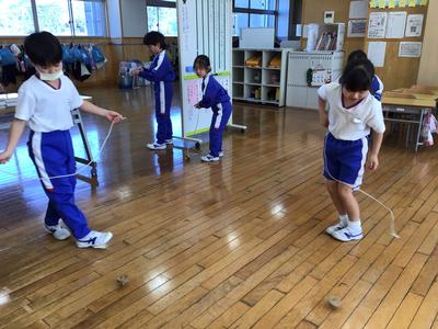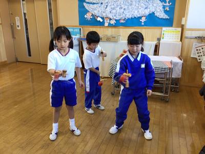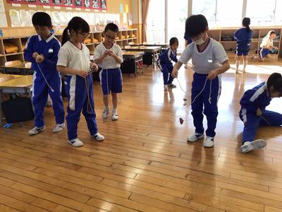 生活科の学習で昔遊びに取り組み、今日はこまとけん玉に挑戦しました。ひざを使って玉をうまく受け止めようとけん玉をする子、こまのひもを巻くのに苦戦する子、上手に回せて手乗せにまで挑戦する子など、いろいろな姿が見られました。友達と一緒に、昔遊びの楽しさを味わっていました。