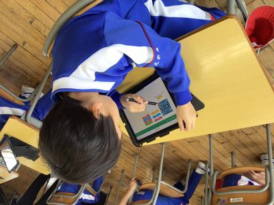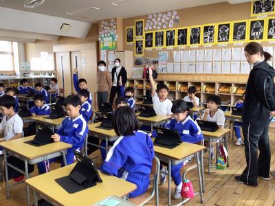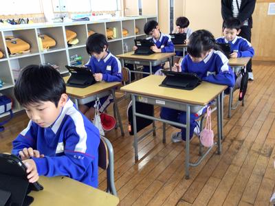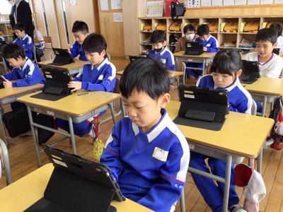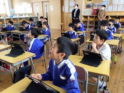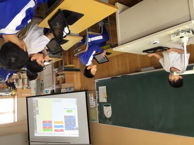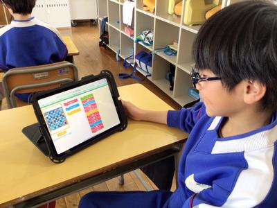 算数で、タブレットを使ったプログラミング学習に挑戦しました。ロケットの向きに気をつけながら、目的の場所まで動かすプログラムを考えました。前進の動きと左右の回転を組み合わせながら試行錯誤し、どの子も真剣な表情で学習に取り組んでいました。