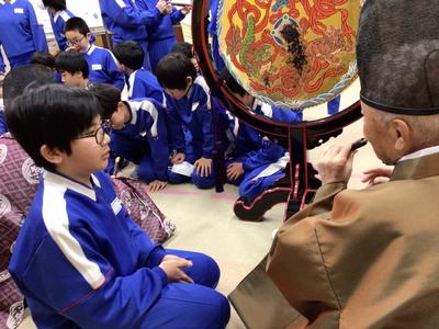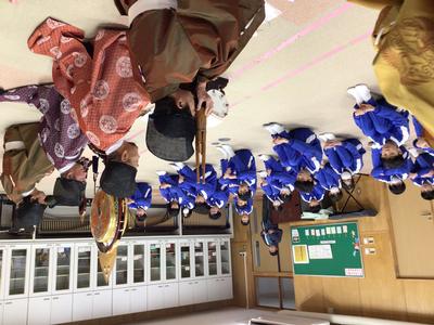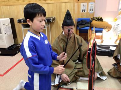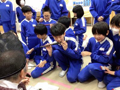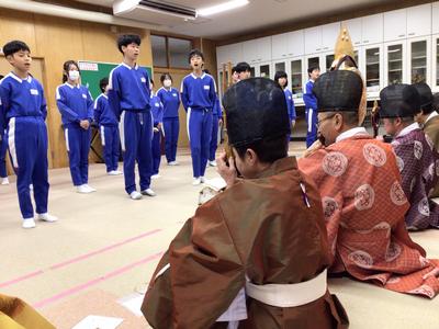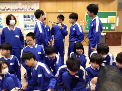 音楽の時間に、日本に古くから伝わる「雅楽」について学習します。今日は、地域の雅楽グループの方々から、雅楽の歴史・楽器の特徴などについて教えていただきました。その後には、雅楽による「君が代」や「越天楽」の生演奏。雅な音色が音楽室中に響き、平安時代にタイムスリップした気持ちになりました。
