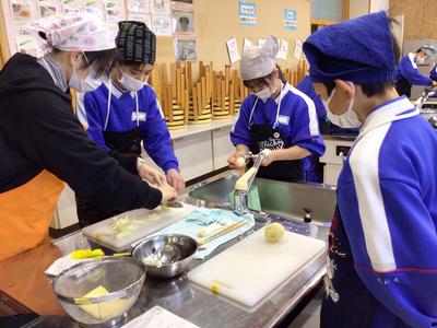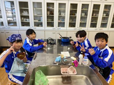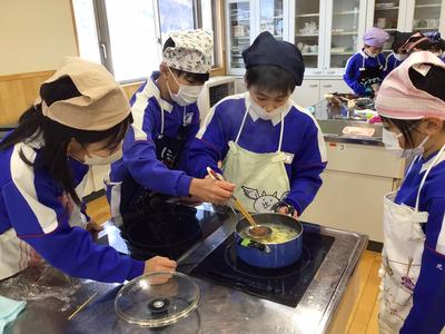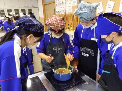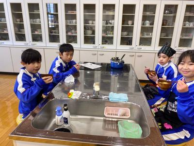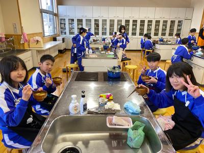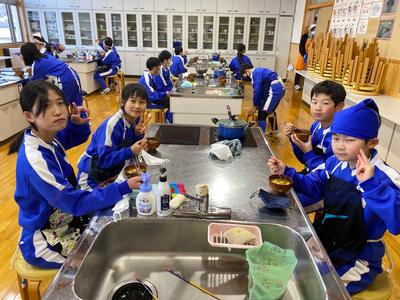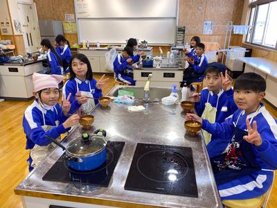 家庭科の学習で、味噌汁を作りました。じゃがいも、玉ねぎ、油揚げなど、包丁を使う場面がたくさんありましたが、友達と協力しながら上手に切ることができました。煮干しの出汁がきいた、とてもおいしい味噌汁が出来上がり、「おいしい」と何度もおかわりをする子もいました。煮干し以外の出汁でも味噌汁を作って、食べ比べするとおもしろいですね。