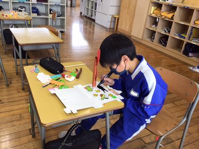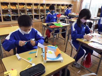 図工の時間に、磁石の性質を使って動きを楽しむ工作をしています。車を走らせるコースや魚釣りゲームなど、工夫して作品を作っています。みんなの作品が出来上がったら、それを使って遊ぶ予定です。どのような作品が仕上がるのか、今から楽しみですね。