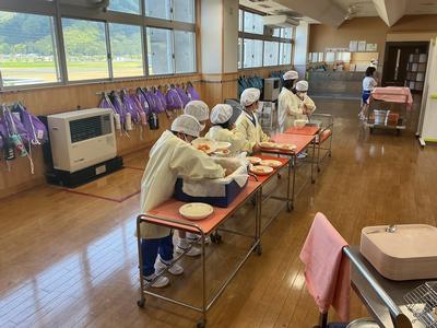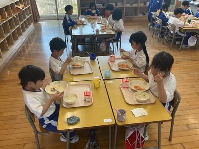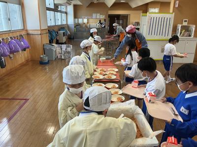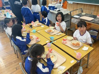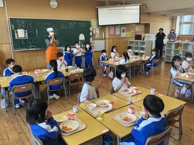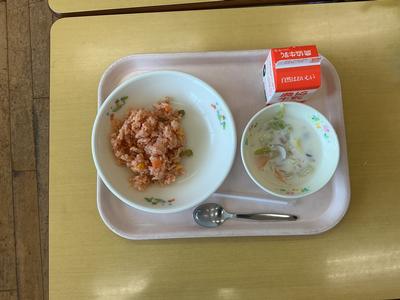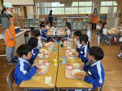 今日から1年生の給食がスタートしました。今日のメニューは、チキンライスとやさいのクリームスープです。児童たちは、給食を楽しみにしていたようです。