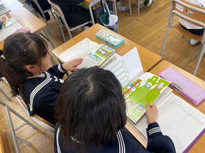 3年生が算数で『九九の表を使って数あてゲーム』に取り組んでいました。大切な2年生の復習です。算数だけではありません。漢字ドリルを使って、2年生の漢字も復習していました。