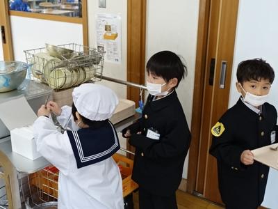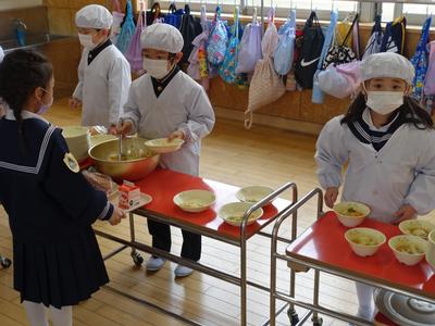 給食の時間です。今回は1年生の配膳の様子をお届けします。みんなが分ける様子を見ていましたが、とっても上手でしたよ。