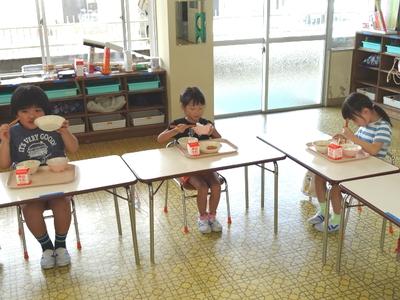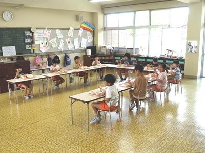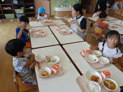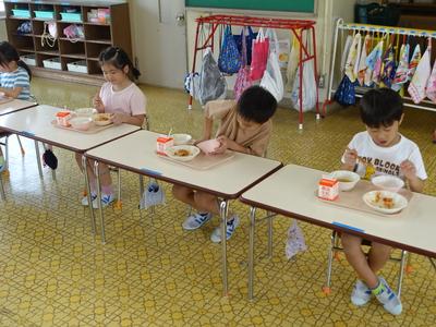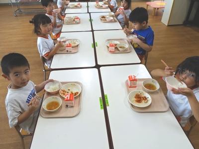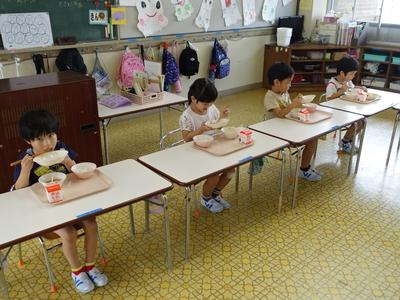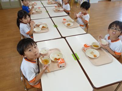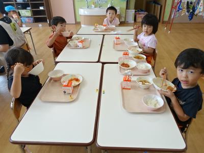 給食を美味しくいただいているところをお届けします。みんな、食べるときの姿勢もバッチリですね。