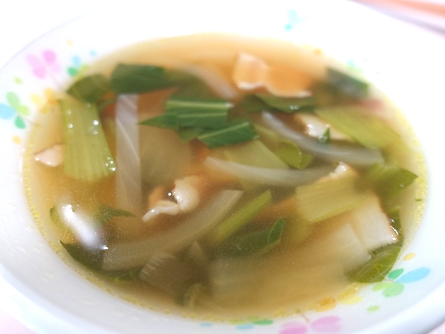 今日の献立は ご飯 牛乳 切り干し大根の焼きそば風 ジャガイモとチンゲンサイのスープ です。切り干し大根は焼きそば風にすることで、苦手な子でも美味しく食べられるよう、工夫されていましたよ。