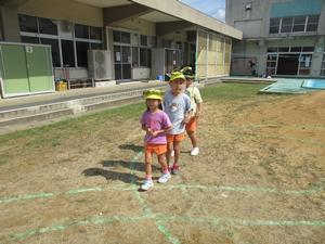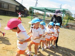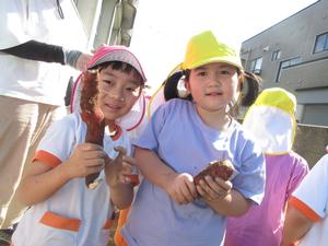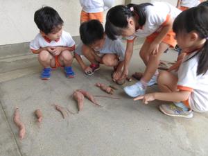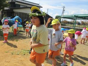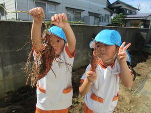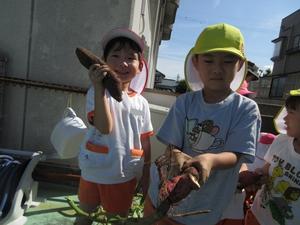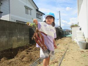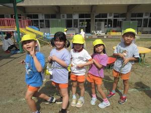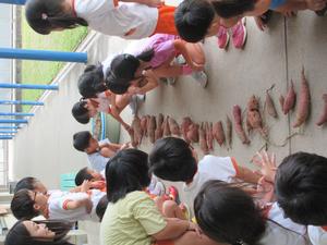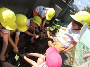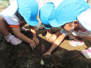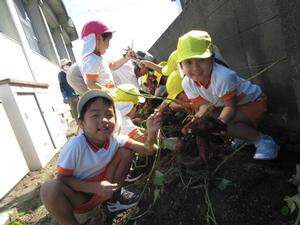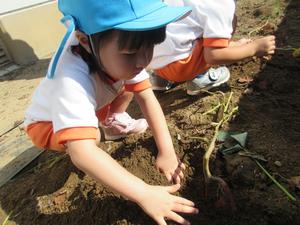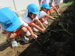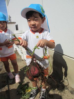 みんなでいもほりをしました。「大きなおいもをほりたい!」と期待いっぱいの子ども達。おいもが傷つかないように、優しく手で掘る姿が見られました。いもほりの後は、いものつるを使って遊び、なわとびやつなひき、でんしゃごっこなどを楽しみました。